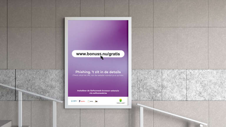 We trapten af met een opvallend live-moment tijdens de persconferentie in Brussel. Net zoals in de slogan, zat het ook hier in de details. De levensgrote url van safeonweb.be bevatte stiekem een extra letter, en in de schaduw hield zich een 'phisher' schuil. Plots kwam die tot leven en nam met een spectaculaire freerun de benen, tot verbazing van de vele voorbijgangers.